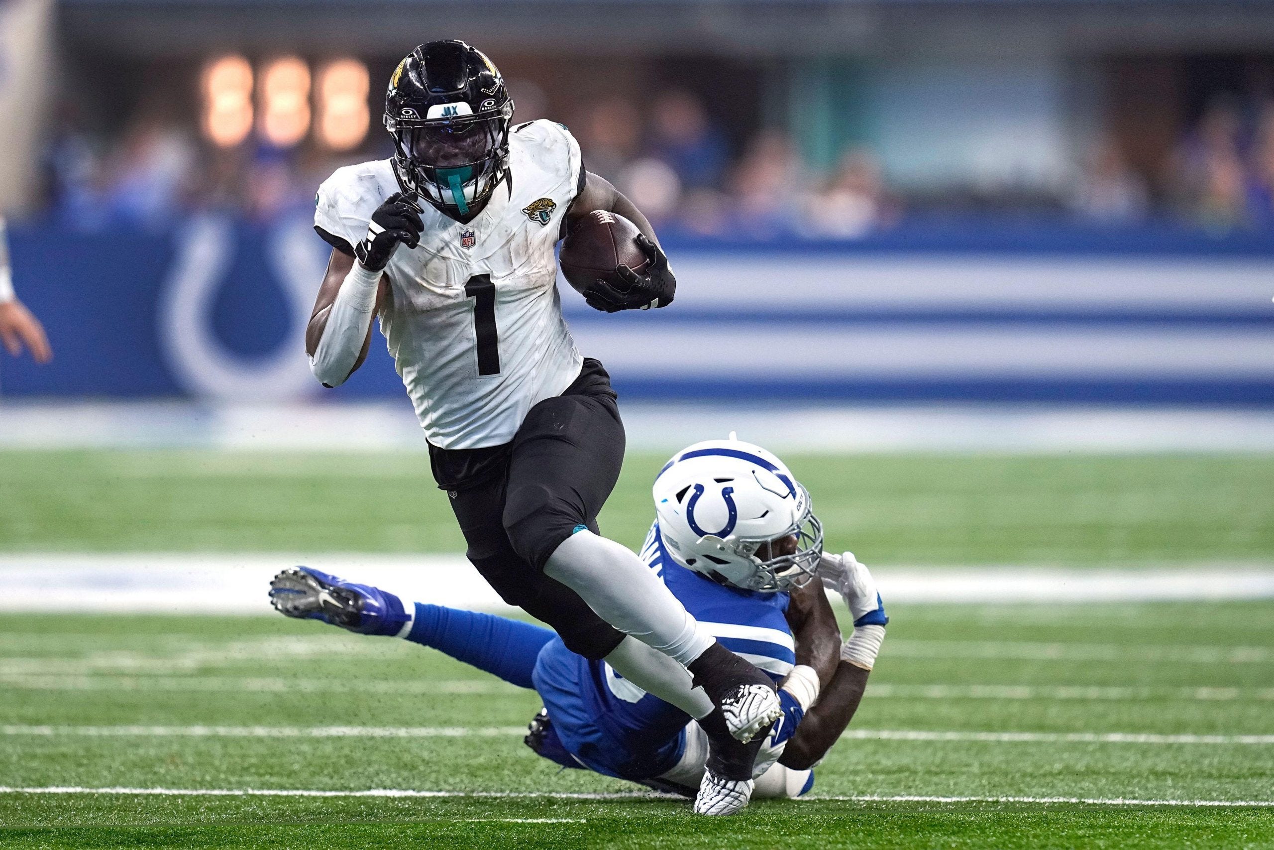 Image 3: RB Travis Etienne (1) making a Colts defender miss in space