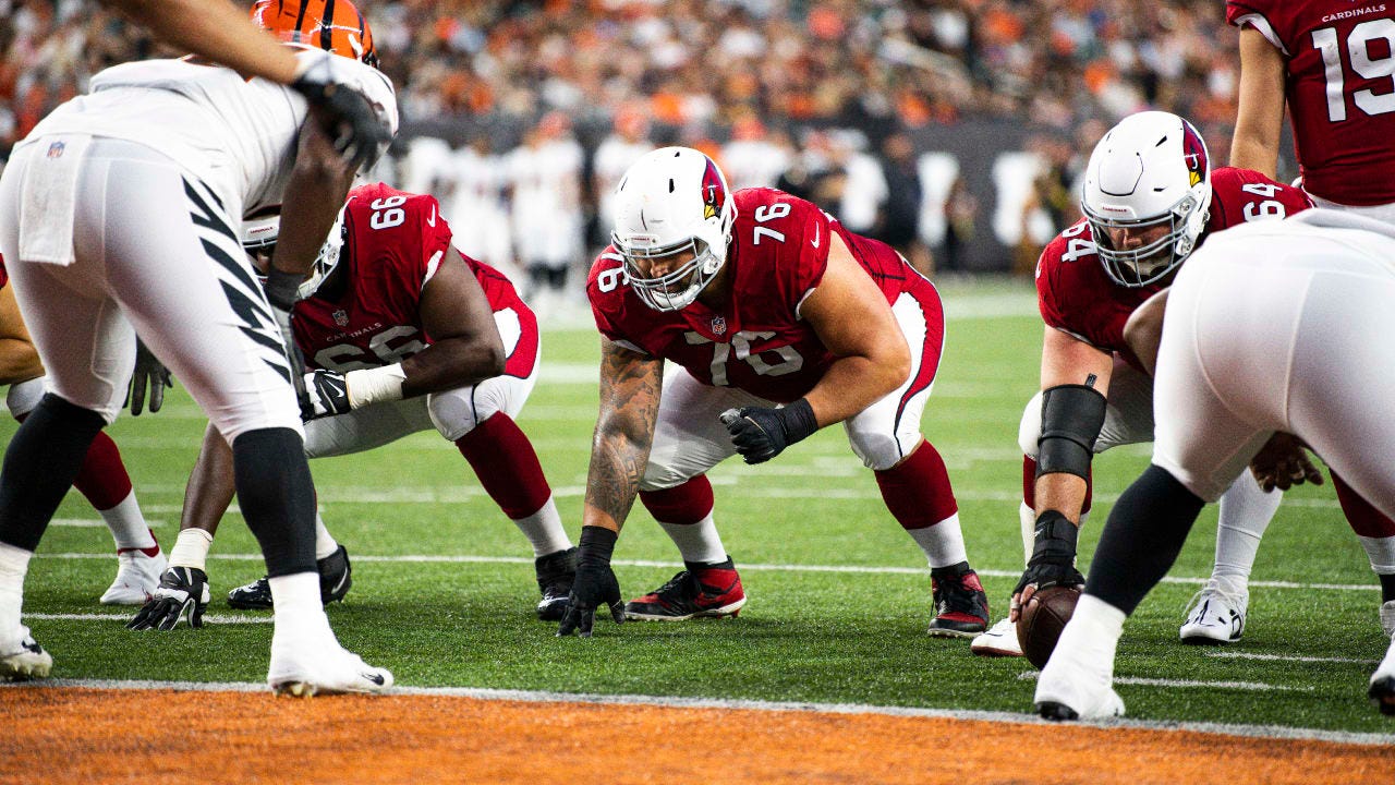 Image 3: OG Will Hernandez (76) in a three-point stance for the Arizona Cardinals
